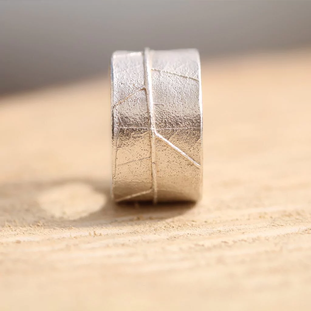 El anillo ancho textura Hoja esta realizado a mano en plata 925, su textura esta dada por una hoja natural y son visibles infinitas nervaduras.