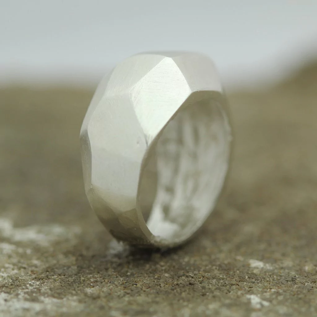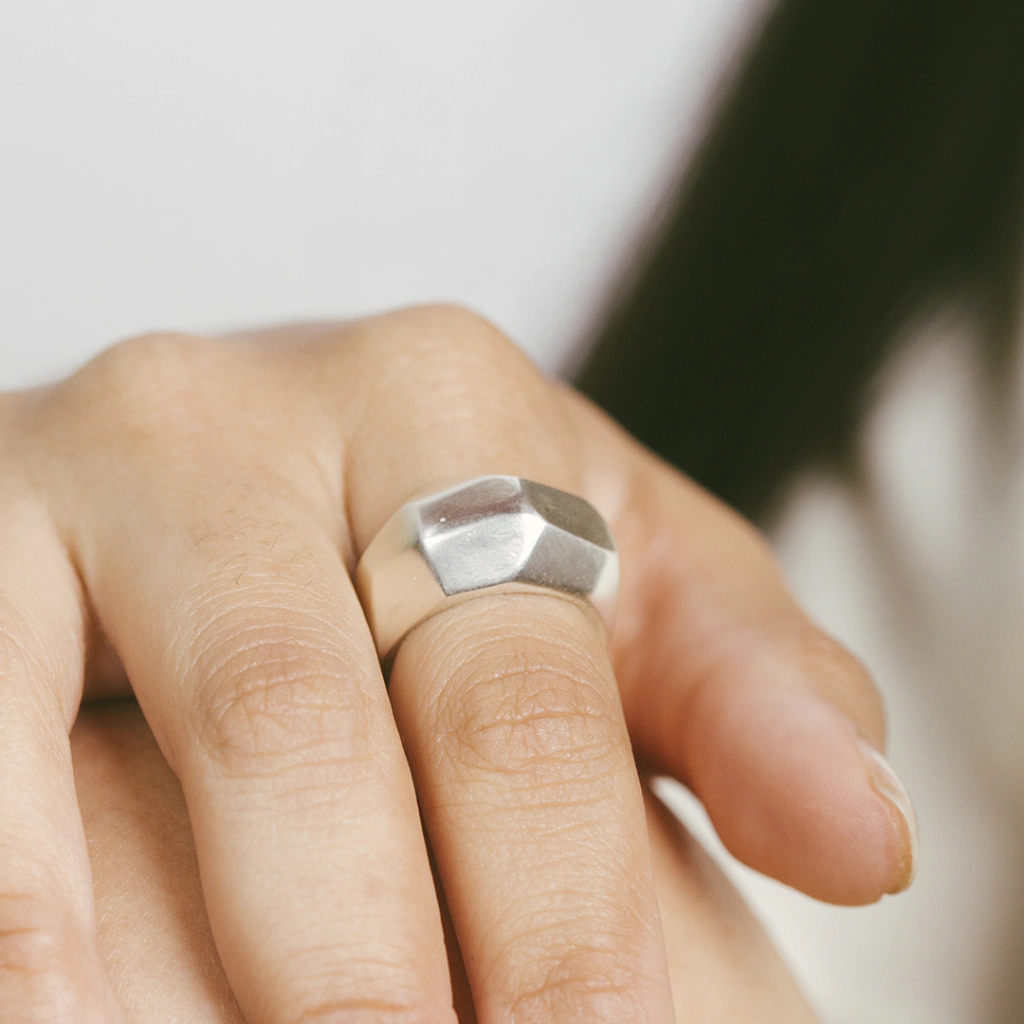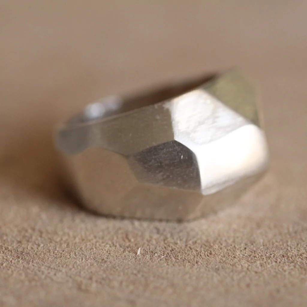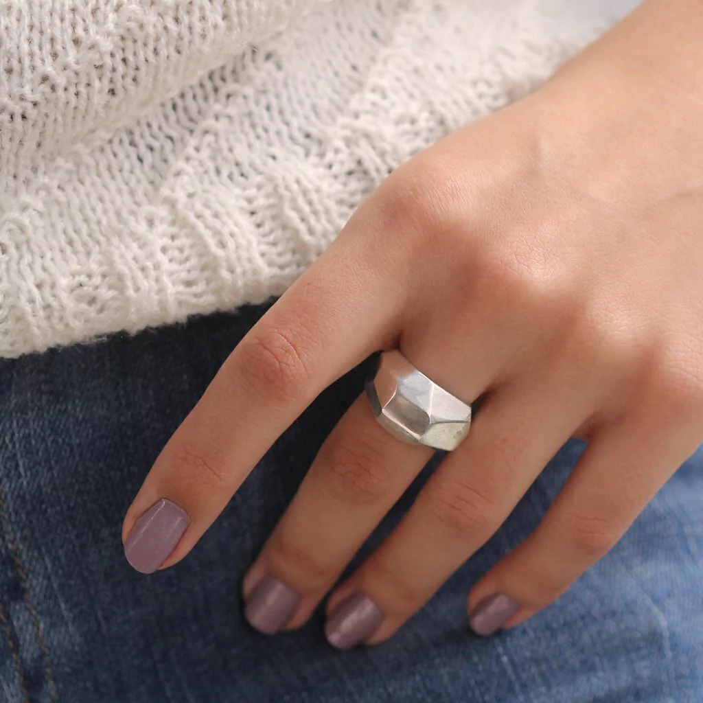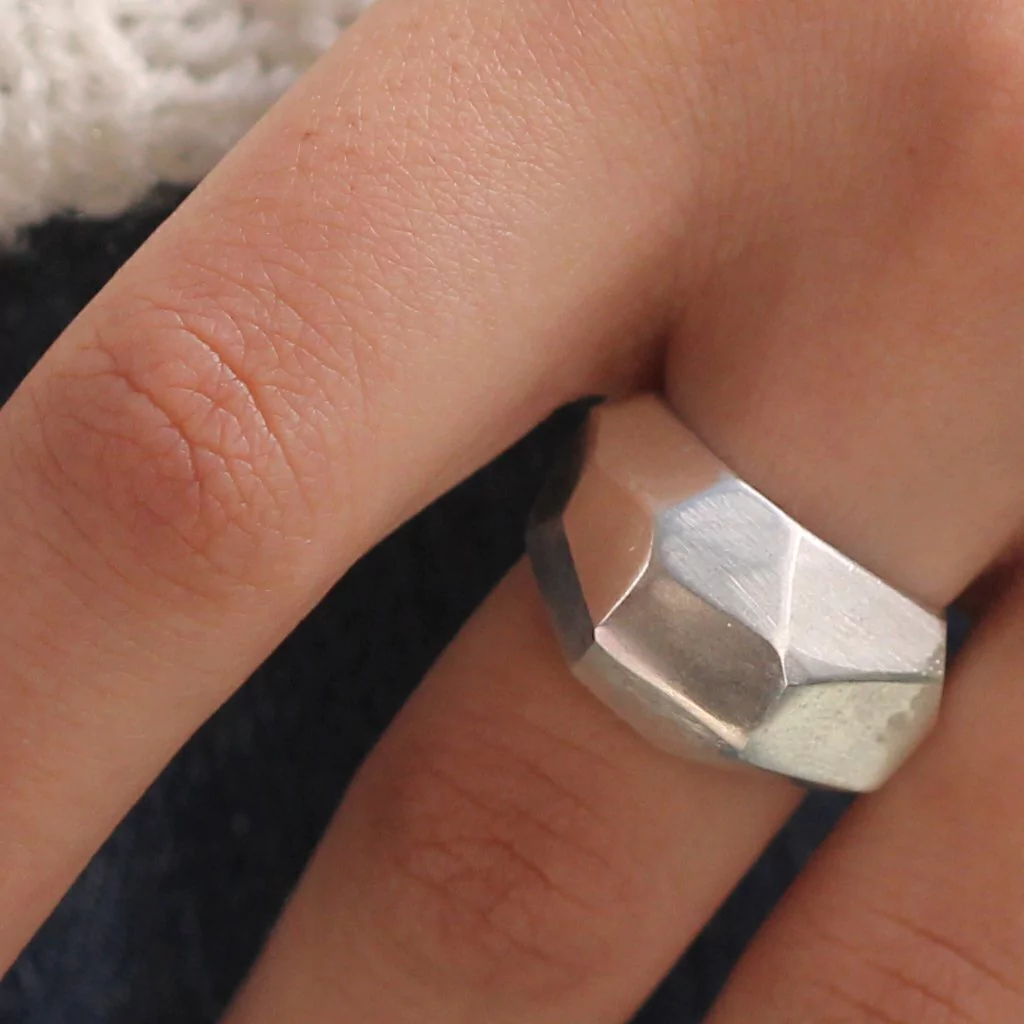 El anillo Bombe Geo esta realizado a mano en plata 925, tiene una estetica urbana, moderna y futurista, con lineas rectas, y textura facetada. Ideal para usar solo, viste completamente la mano.