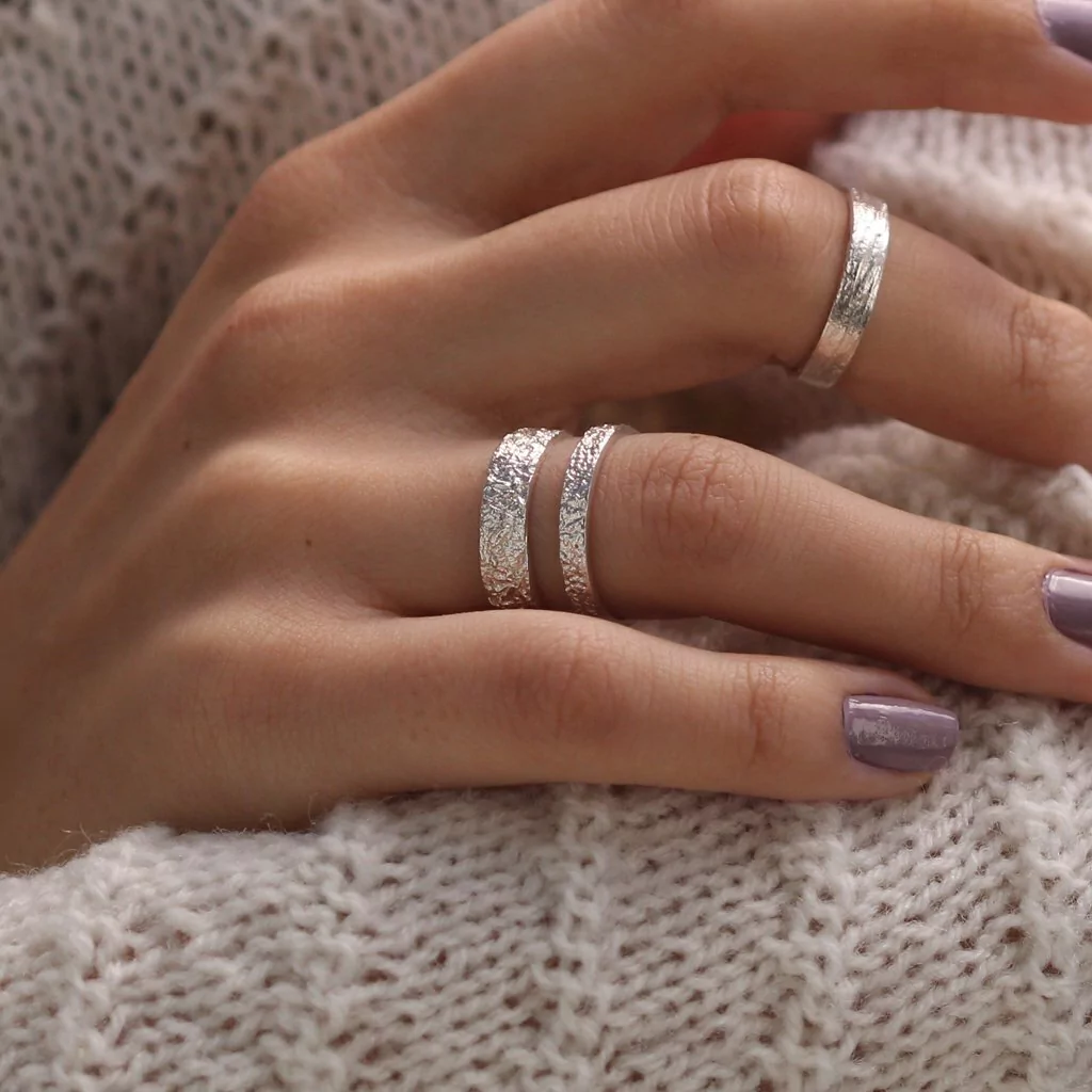 El anillo texturado fino Aluminio esta realizado a mano en plata 925, esta hecho a partir de la textura del papel de aluminio arrugado. Es super original, y la textura le aporta un toque unico.