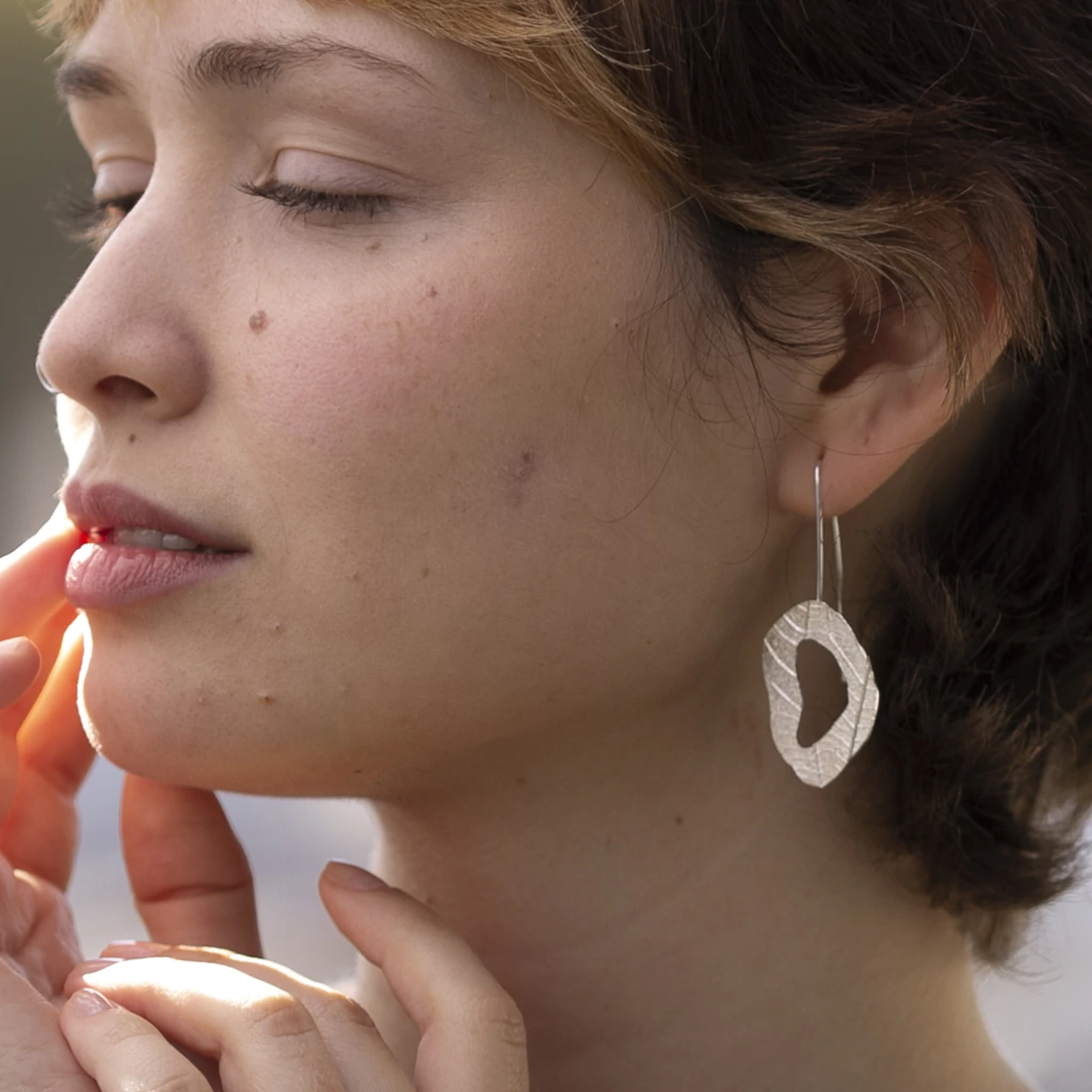 Los aros Lia Iris estan realizados a mano en plata 925, la textura es de una hoja que nos trajimos de un viaje a Cuba.