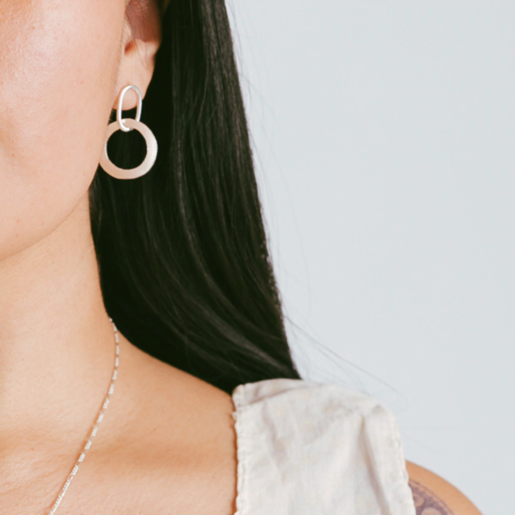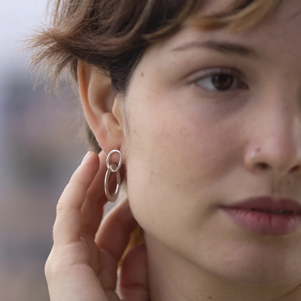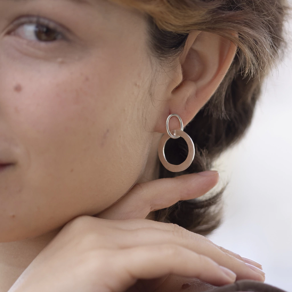 Es un aro geometrico, de dos argollas, una ovalada pequeña y otra redonda mas gruesa, es simple pero super delicado.