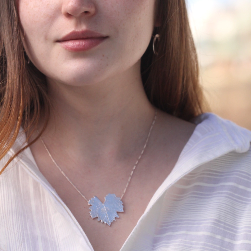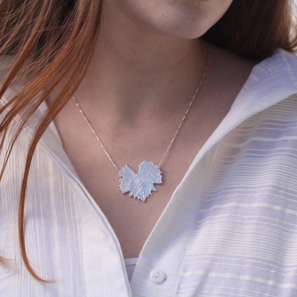 El collar hoja Malbec esta realizado a mano en plata 925, en base a una hoja original de parra, de Malbec.