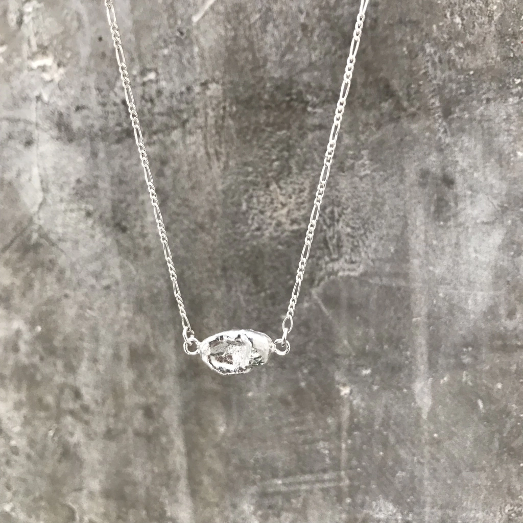 El collar Pepa esta realizado a mano en plata 925, a partir de una pepita de plata en bruto, su forma es organica y asimetrica, es super delicado.