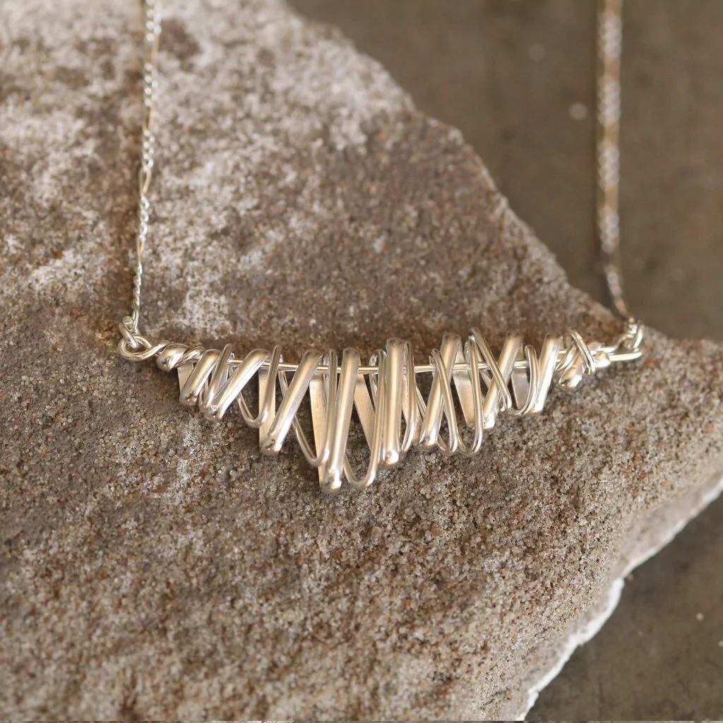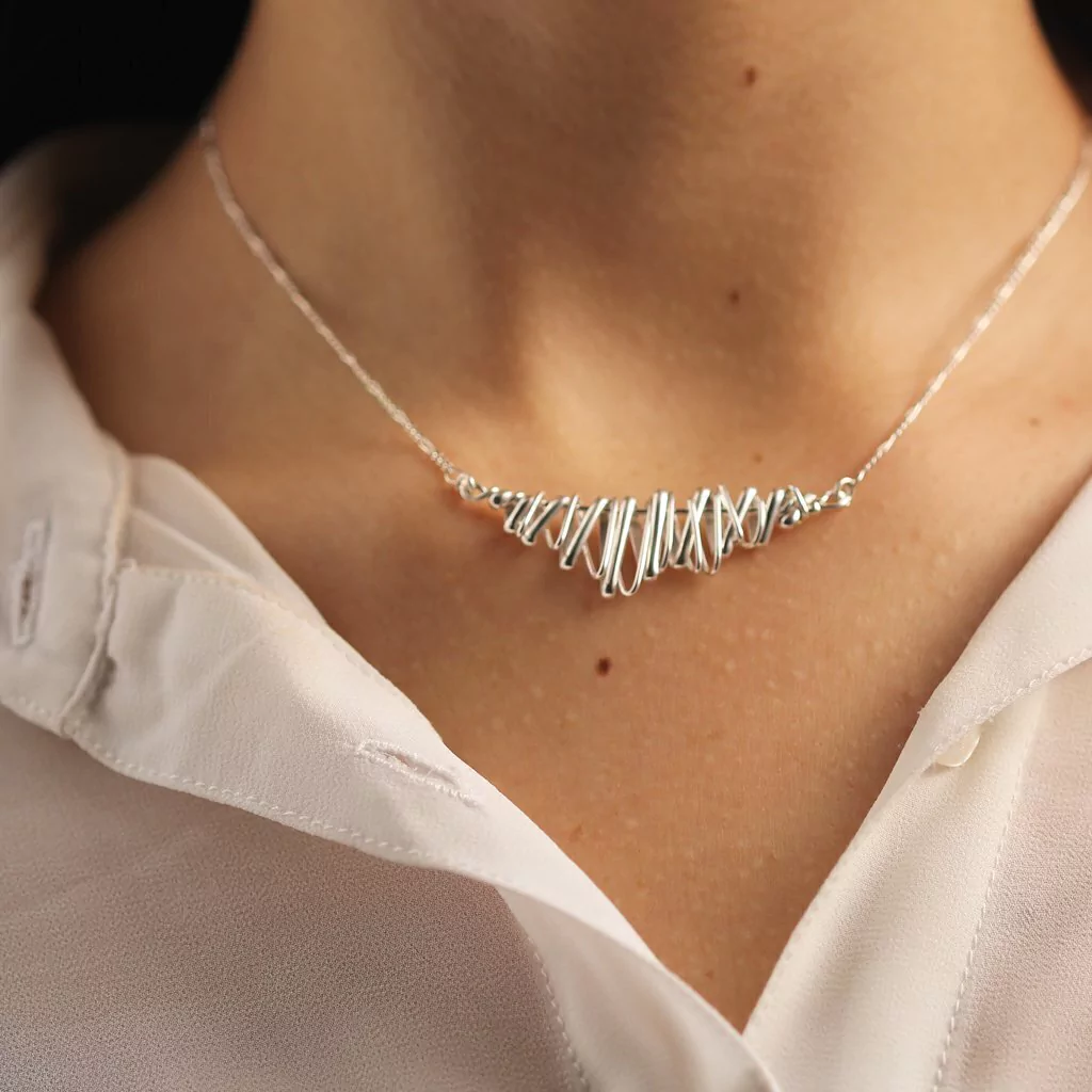 El collar Pollock esta realizado a mano en plata 925, su nombre remite al pintor Pau Jackson Pollock, representante del expresionismo abstracto, y esta hecho a mano, tipo tejido con alambres de plata de distintos espesores y formatos, es 100% original y moderno.