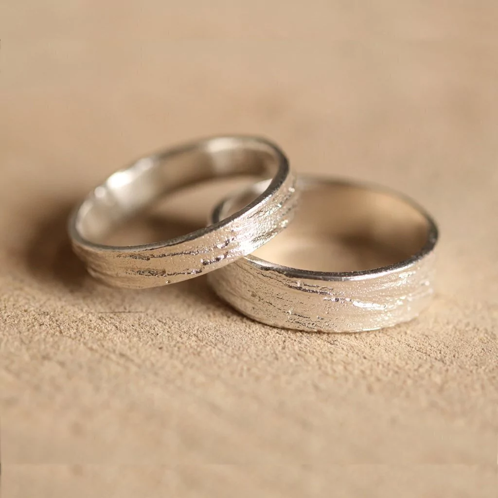 El par de alianzas textura Cedro estan realizadas a mano en plata 925,